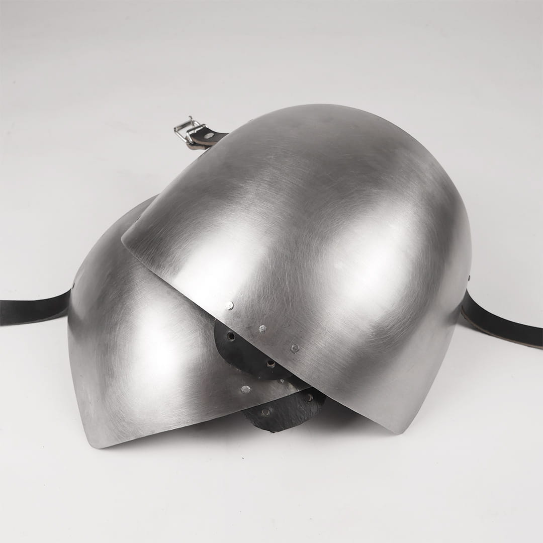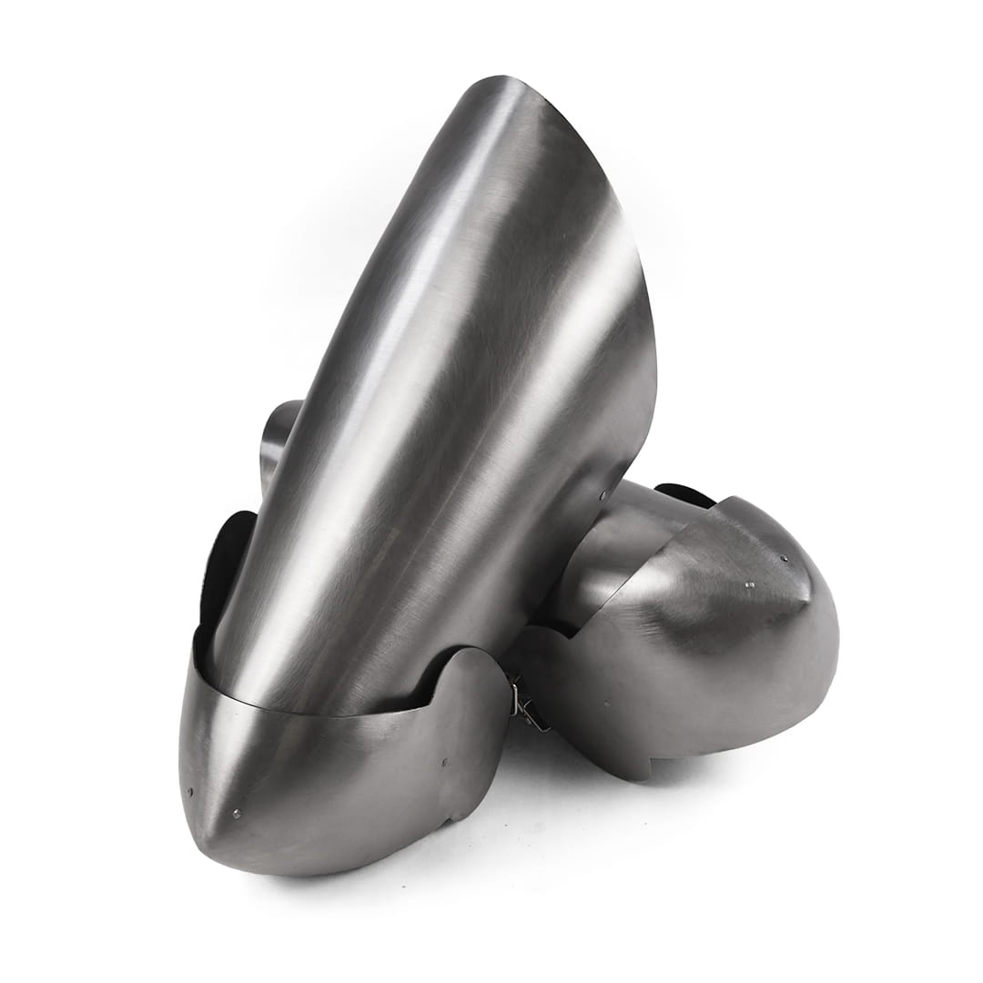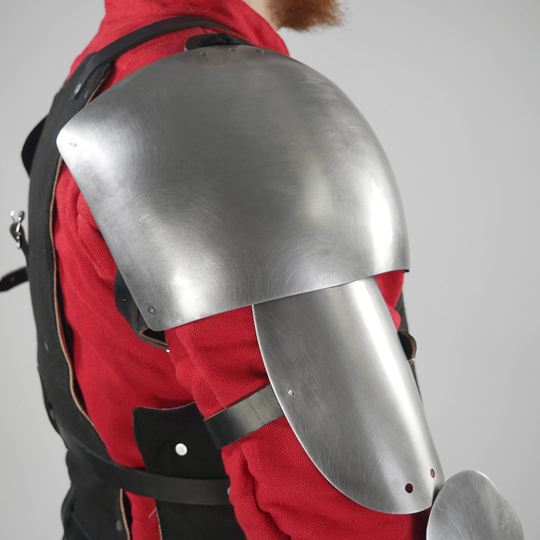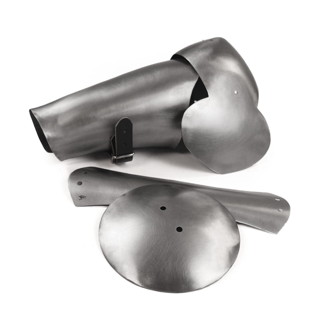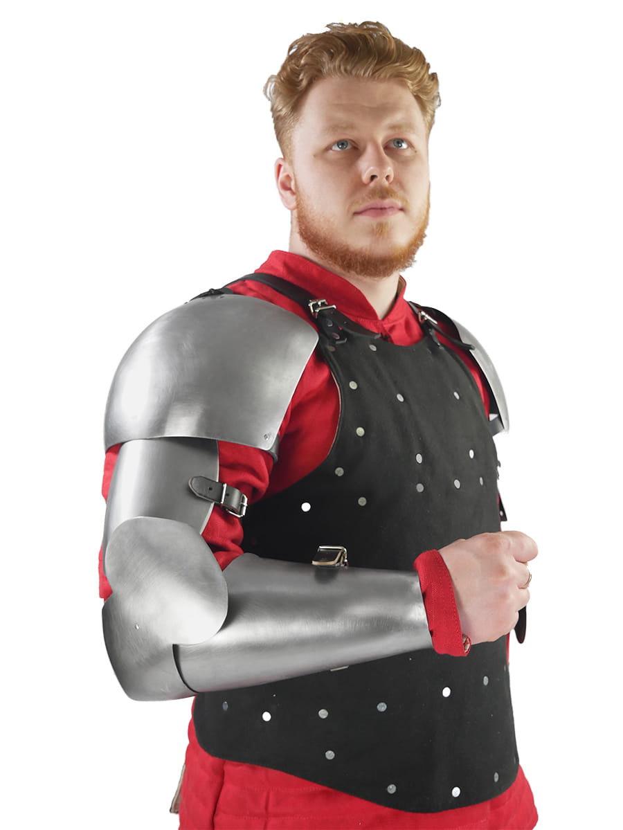 The shoulders are made of 1mm hardened spring steel. The rerebraces are made of 0.8 mm hardened steel. The elbow protection is made of 1 mm steel. This is up to 30% lighter than classic 1.5 mm elbows and every gram counts for every duelist!