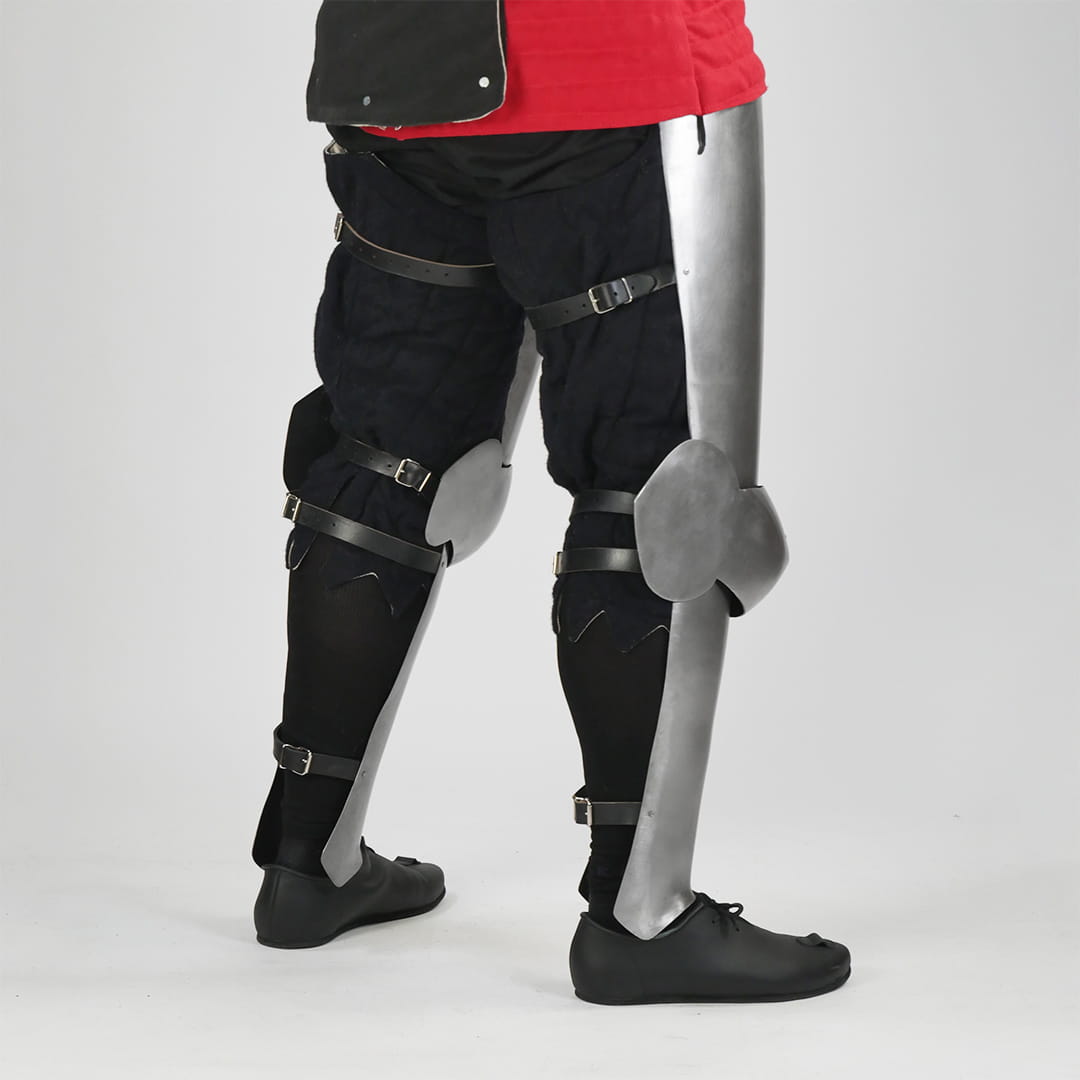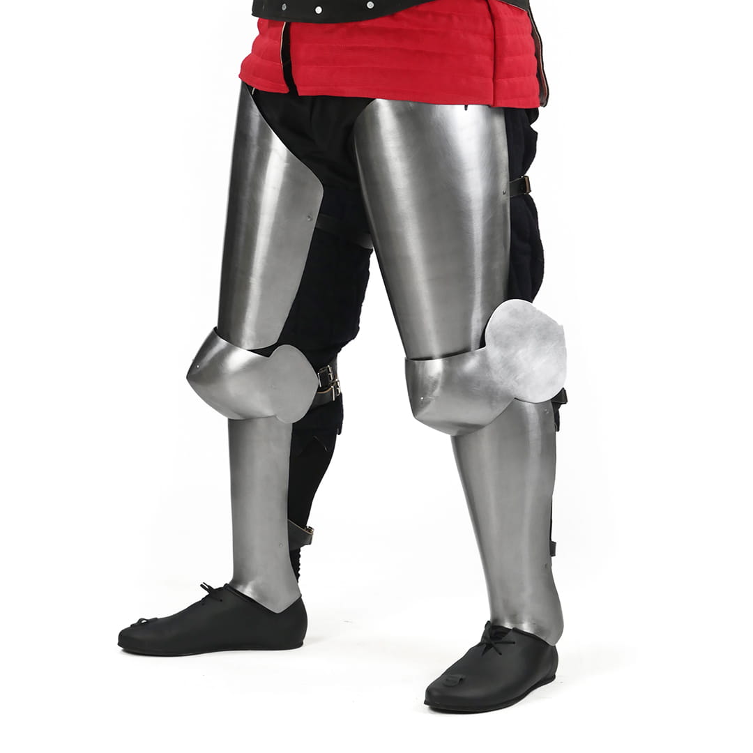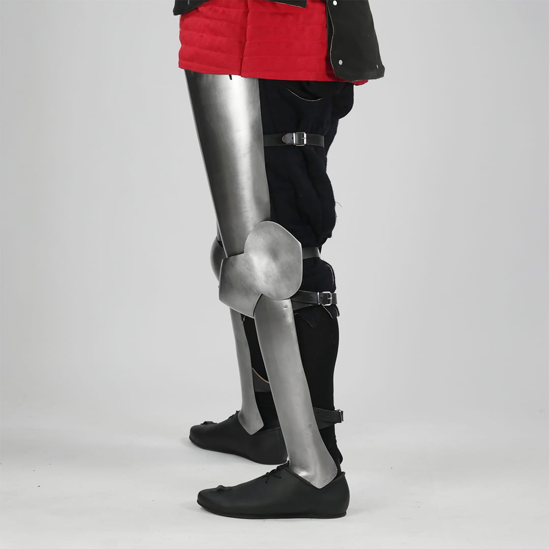 Made from 1 mm hardened steel, the cuisses and greaves cover the front and sides of the leg, significantly reducing overall weight while maintaining essential protection.