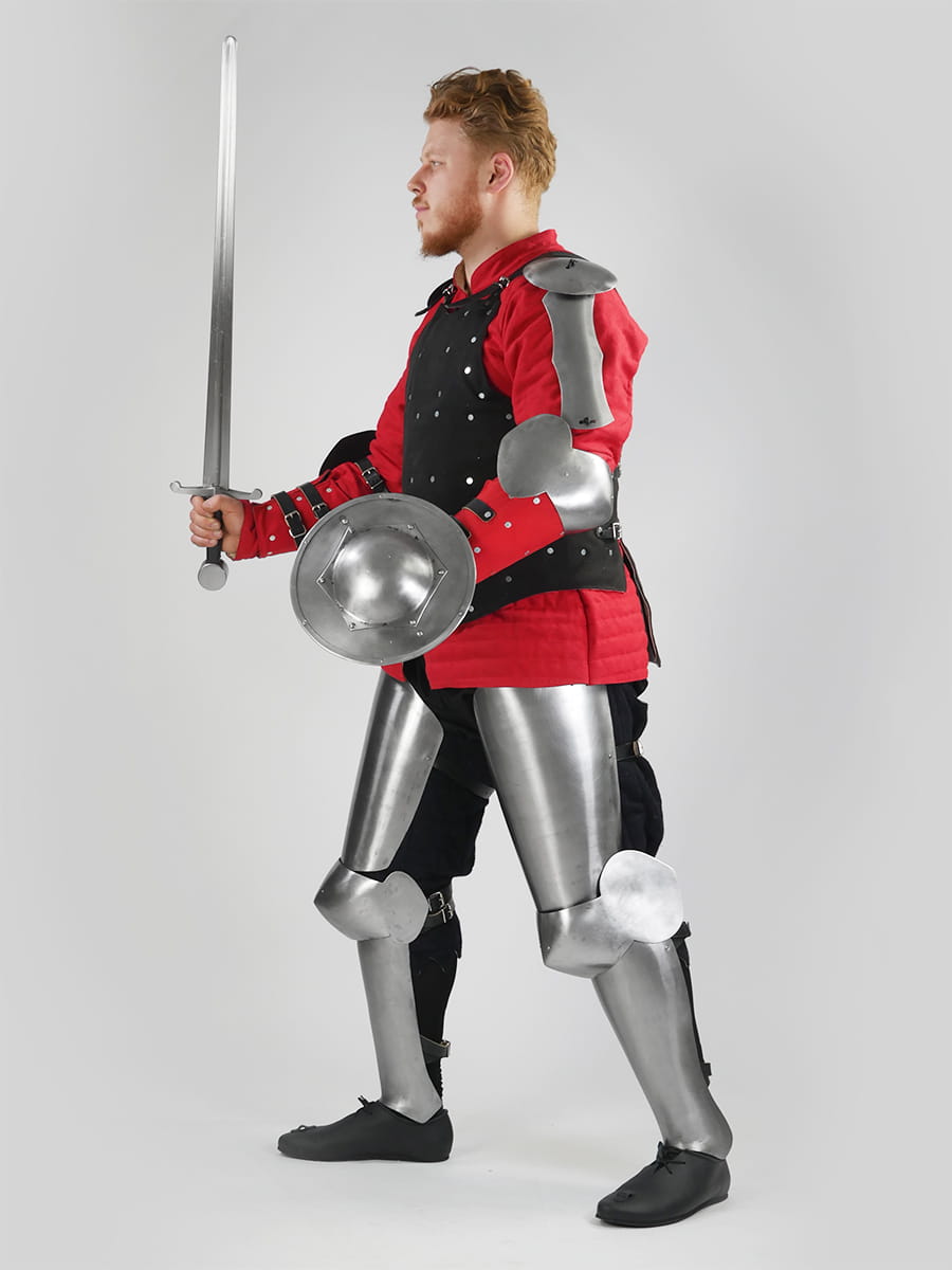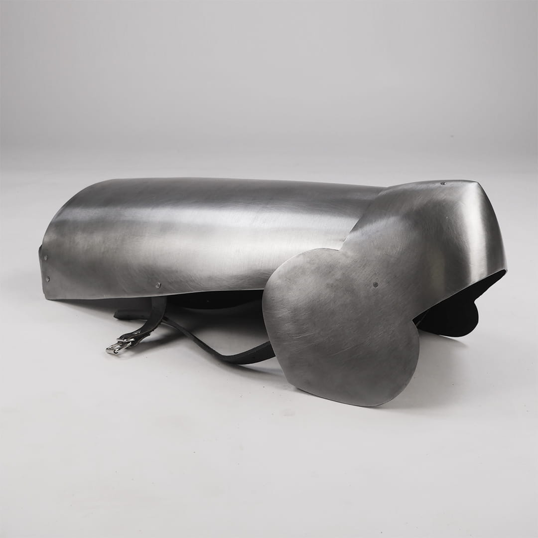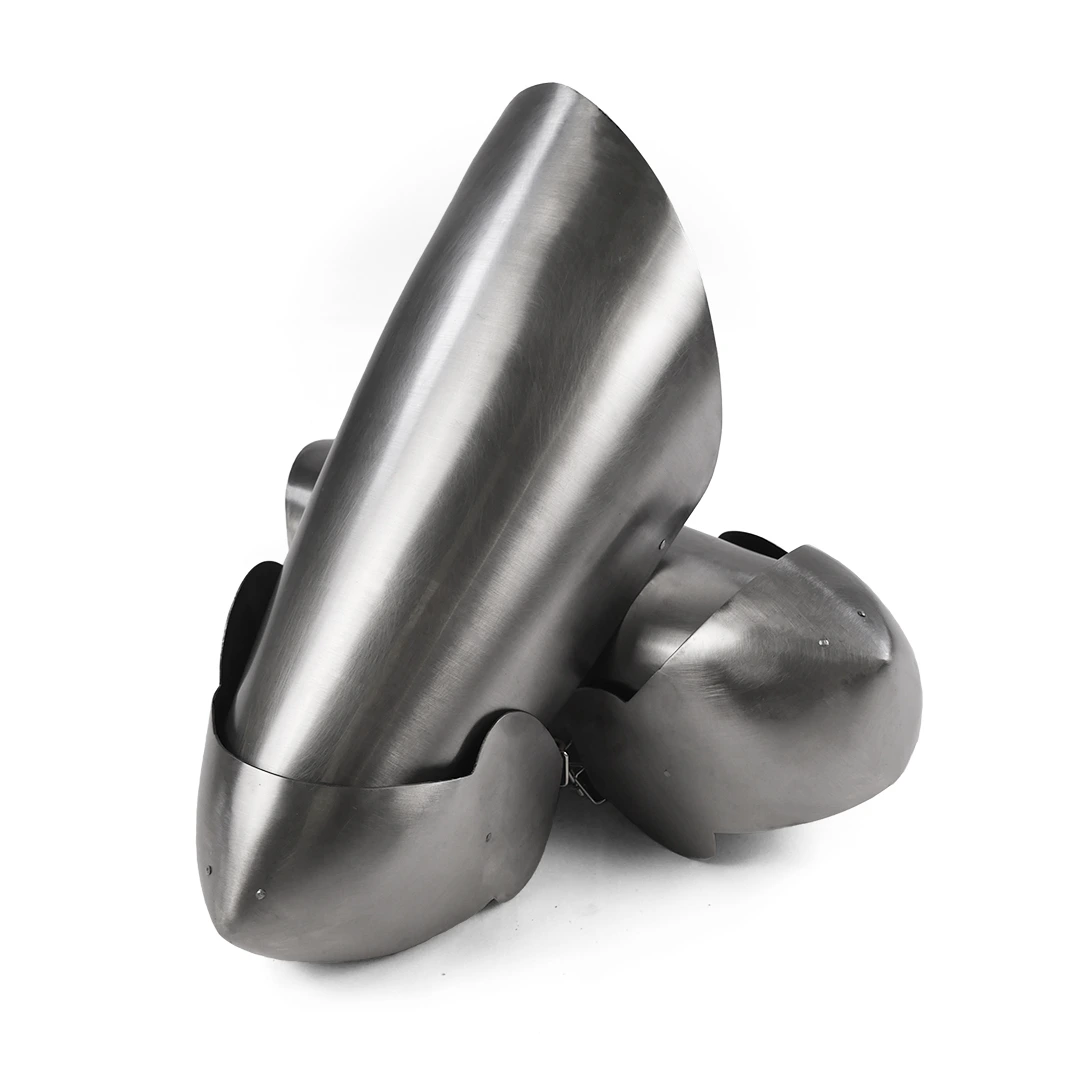 Made from 1 mm hardened steel, the cuisses and greaves cover the front and sides of the leg, significantly reducing overall weight while maintaining essential protection.