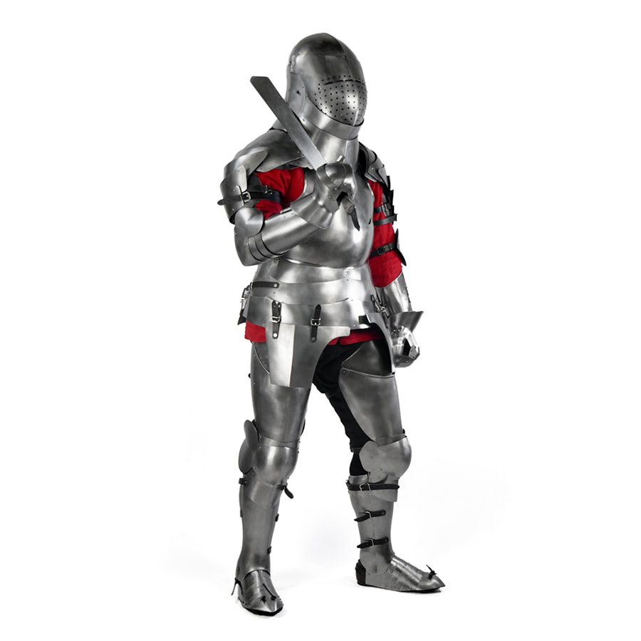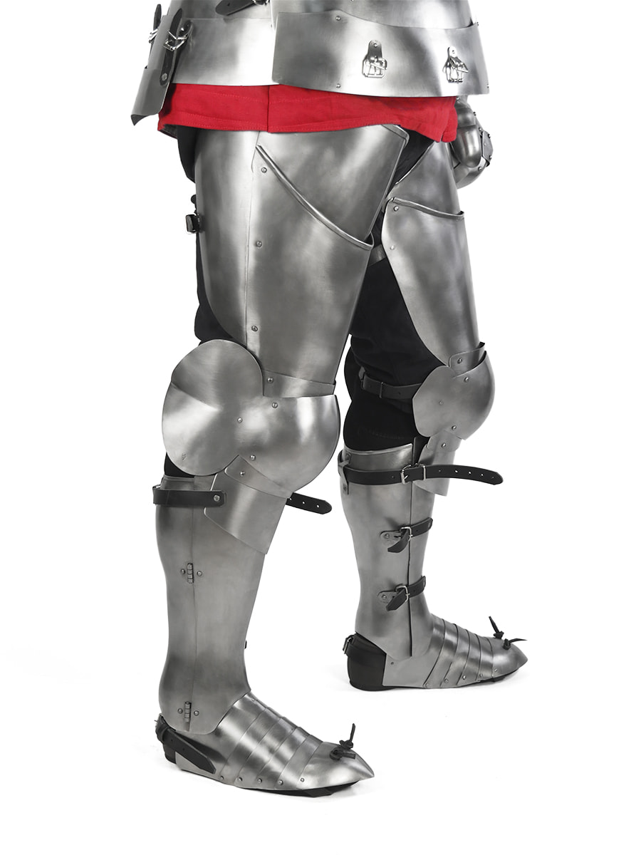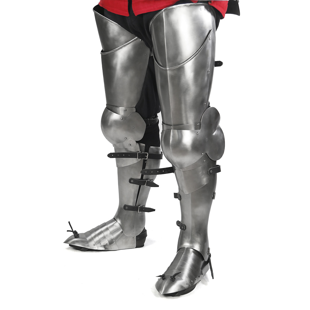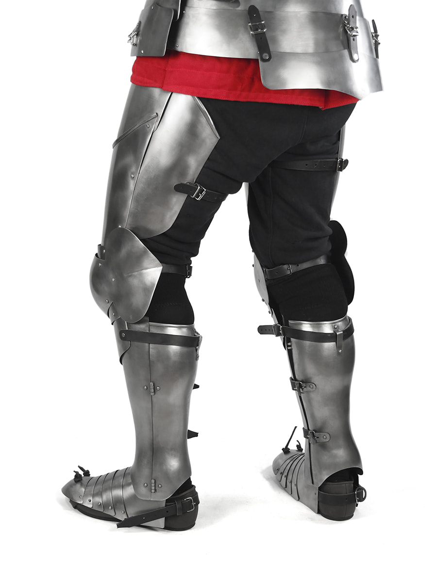 Nogi Guardian - to pełna i folgowa osłona - daje bezpieczeństwo w walkach grupowych i w porównaniu do segmentowych osłon brak przerwy pomiędzy łydką a kolanem. Zastosowane kształty odzwierciedlają anatomię nogi oraz zwiększają walory użytkowe. Mobilność i waga ze względu na folgi jest delikatnie zmniejszona względem naszych nóg Shadow, ale dzięki temu dostajesz dużą dawkę bezpieczeństwa. Łydki to pełne anatomiczne osłony na stalowych zawiasach. Dzięki ich kształtowi chodzenie i bieganie nie jest utrudnione a dystrybucja wagi oraz siły ciosów jest bardzo dobra.
