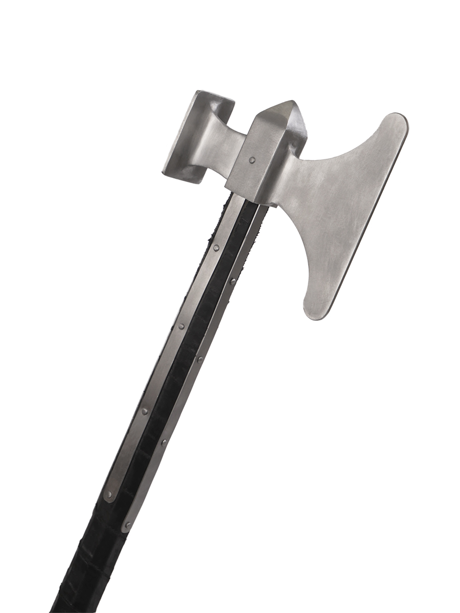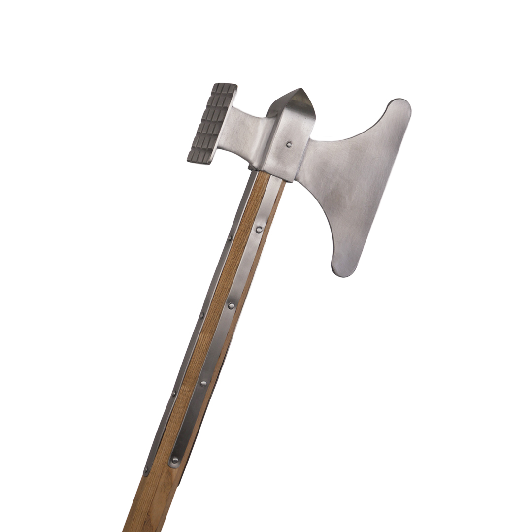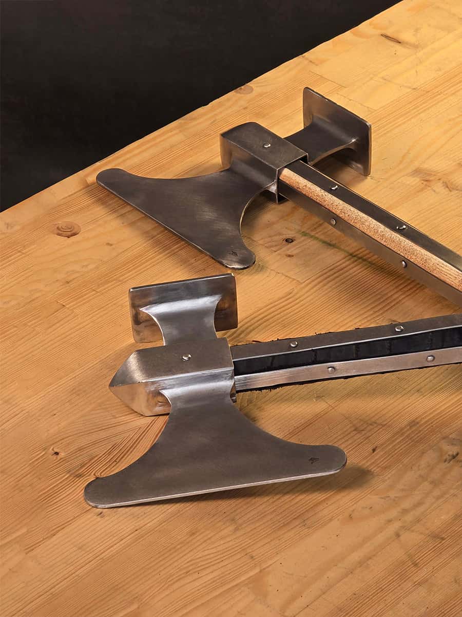 Piękno, styl, skuteczność i wygoda. Tak naszym zdaniem należy opisać ten typ broni. Poprzez posiadanie; młotka, ostrze jest lepiej wyważone, a sam cios głębiej penetruje zbroję. Dodatkowo ta broń posiada walory psychologiczne. Sam przyznaj - poleaxe wygląda bardzo groźnie. Oprawiane są przez nas na jesionowych drzewcach, które przed zanitowaniem są dodatkowo obkręcane przesączonym klejem materiałem.
